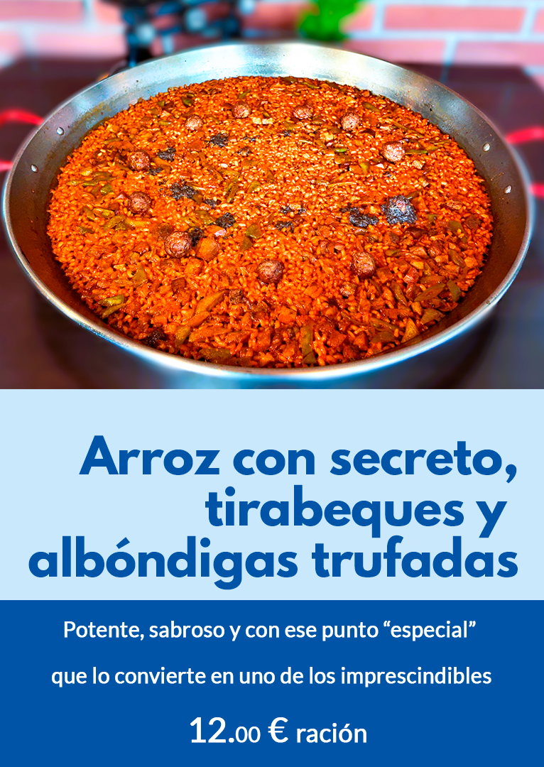 - Arroz con secreto, tirabeques y albóndigas trufadas